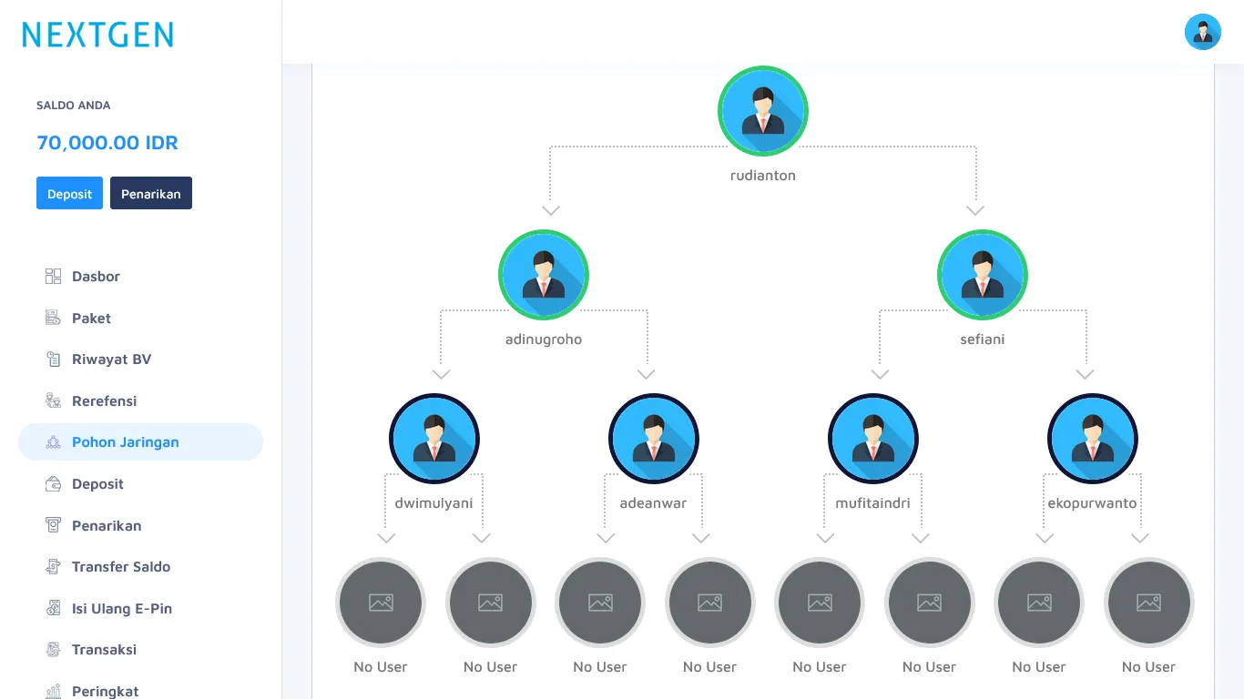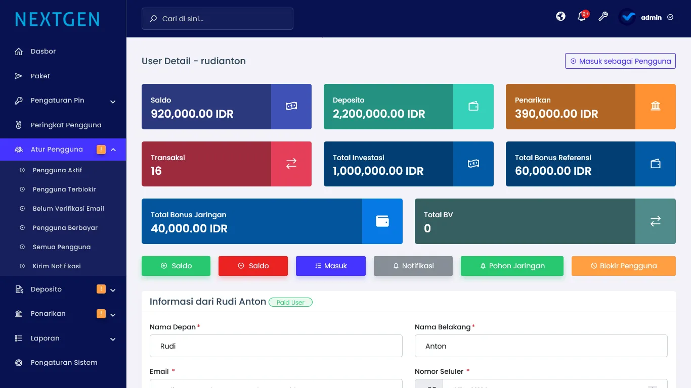 Dasbor admin berisi informasi member yang ada dalam sistem MLM, informasi semua status deposit dana dari member, informasi semua status penarikan dana member, informasi semua bonus referensi, bonus jaringan, bonus matching, bonus peringkat, dan berbagai laporan-laporan lainnya.