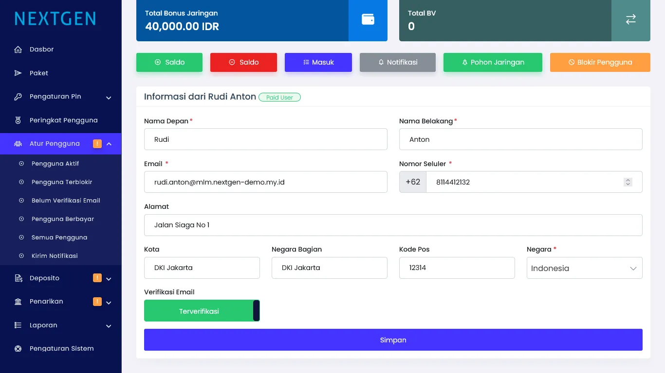 Pengaturan pengguna berisi daftar semua member yang ada, daftar semua member yang aktif, daftar semua member yang tidak aktif (terblokir), daftar member yang mempunyai saldo, detail data member dan informasi lain yang berhubungan dengan member. Admin dapat melakukan verifikasi member baru berdasarkan email atau informasi lain, admin juga dapat memblokir member tertentu.